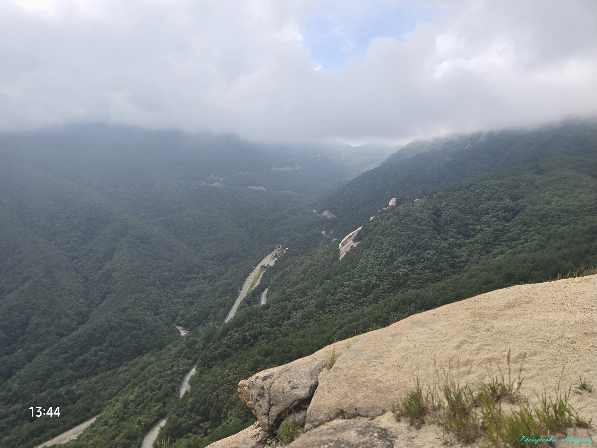 미시령고개 왼쪽 황철봉이 구름을 완전히 뒤집어쓰고 있다