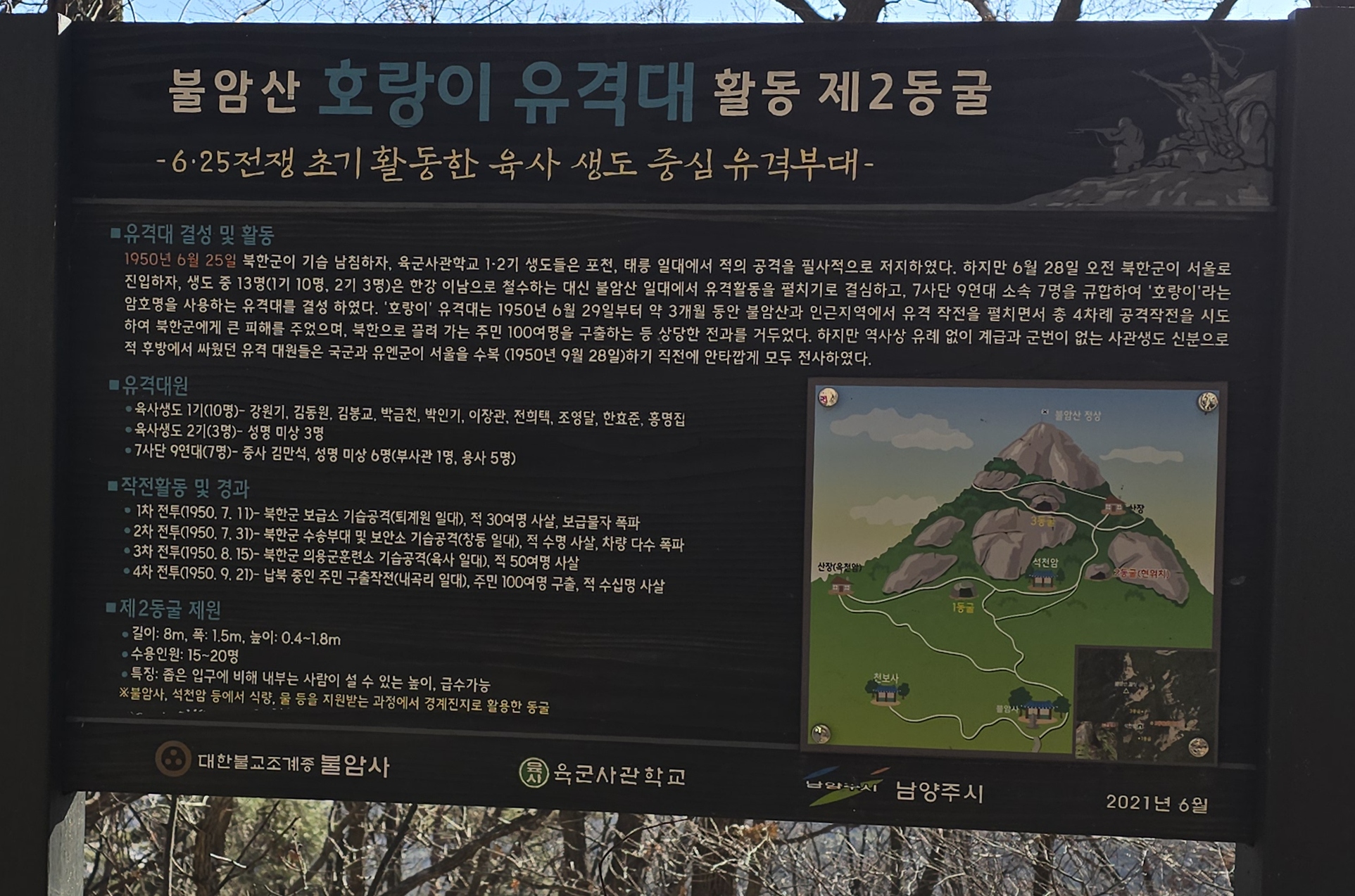 불암사 입구에 세워진 육군사관생도들의 6.25 당시 유격대 활동 기록을 적어둔 안내판
